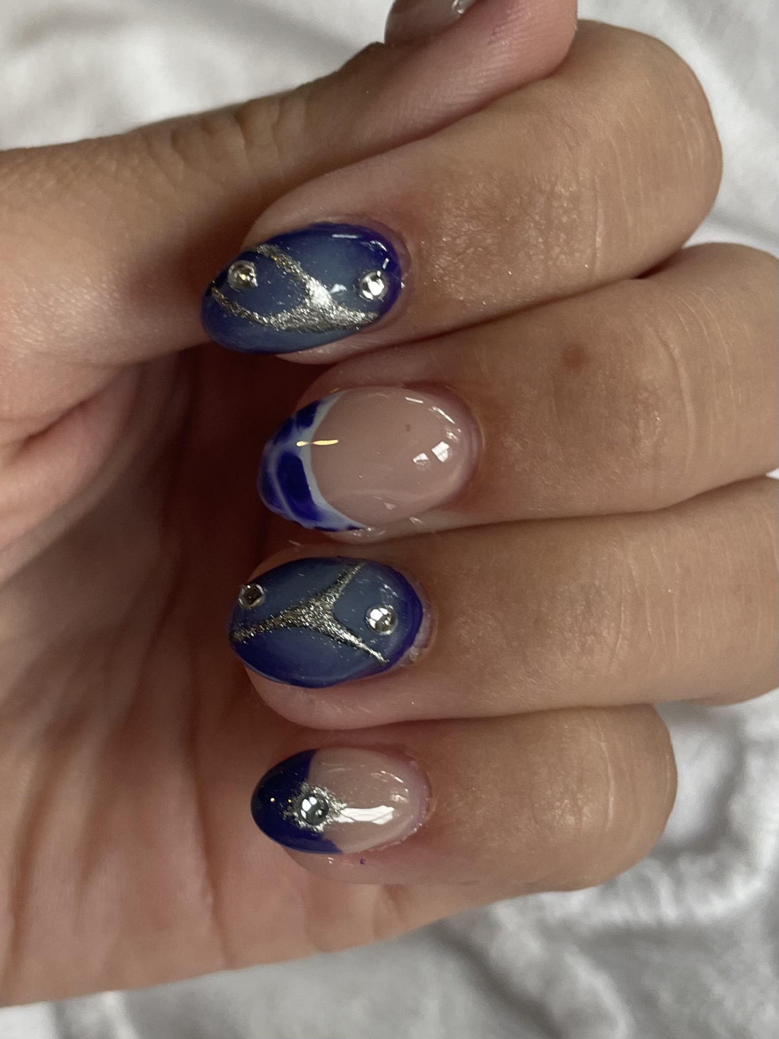 This image features a stylish nail design perfect for attending The Marías concert. The nails showcase a stunning blue aura effect, complemented by sleek silver chrome accents. Adding an extra touch of glamour, sparkling gems are delicately placed on each nail. This combination creates a unique and sophisticated look, perfect for a concert or any special occasion. Ideal for fans of The Marías looking to express their style with a touch of elegance and creativity.